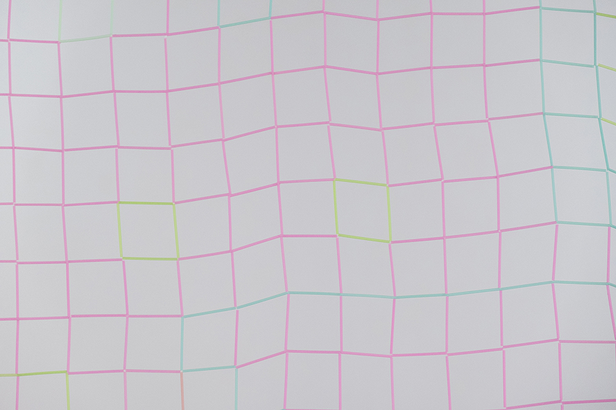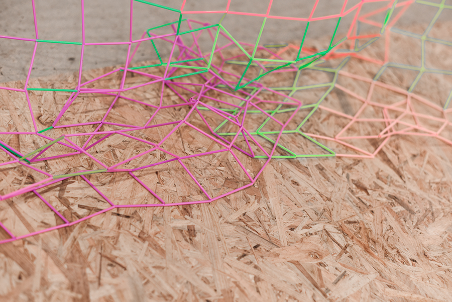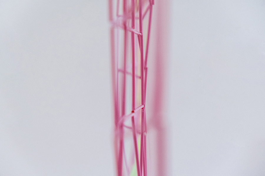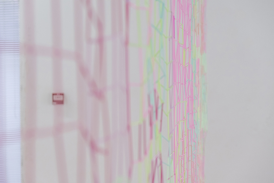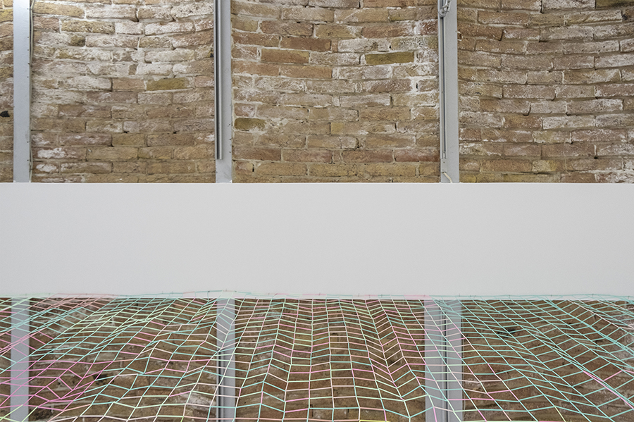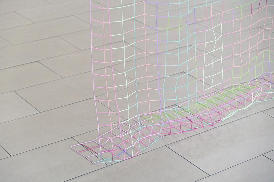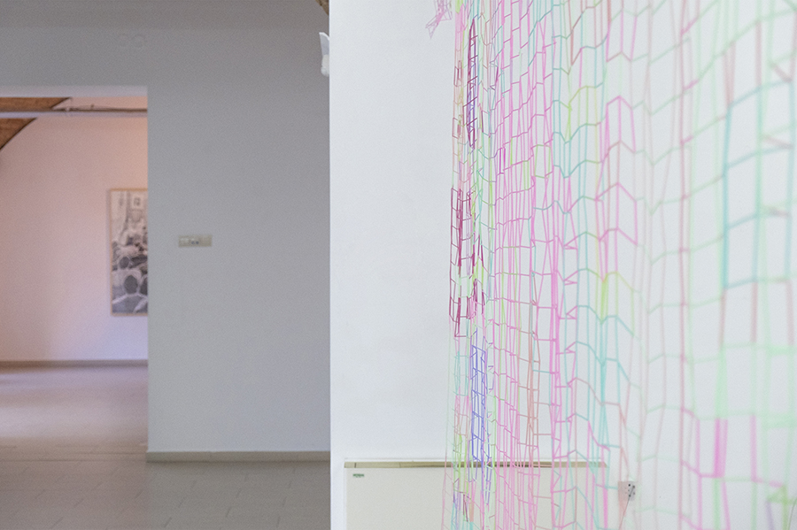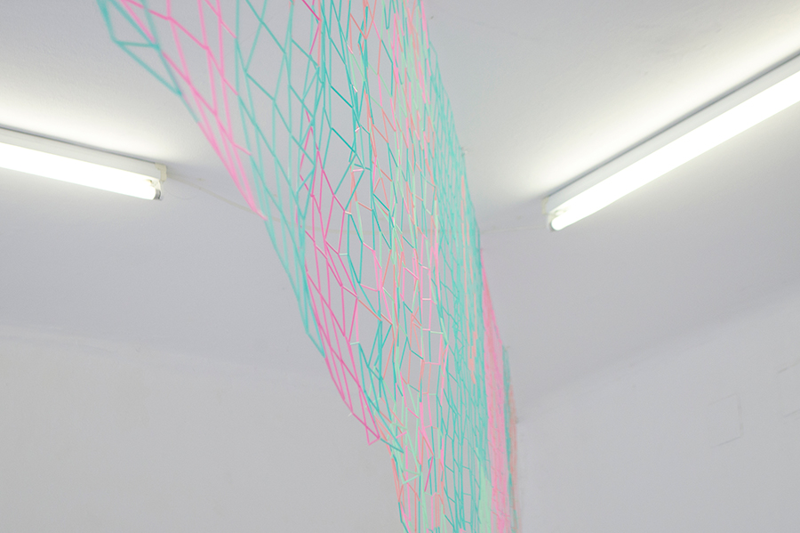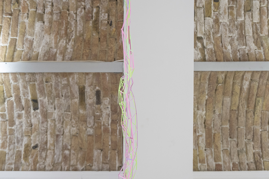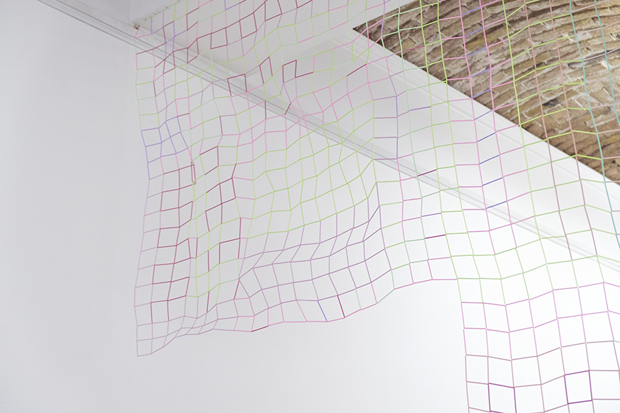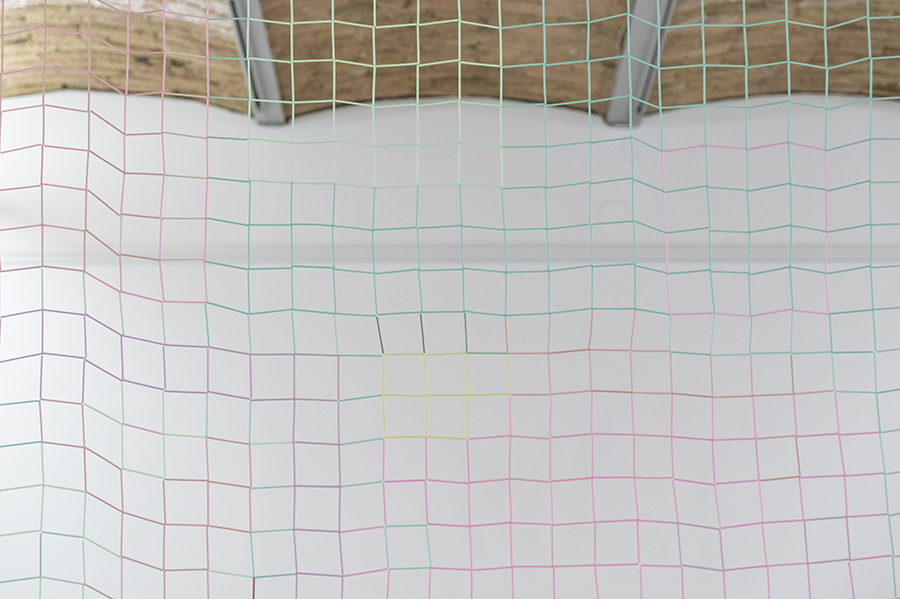 Untitled. 2019. Cotton-buds, nylon thread. 1,1x5,1m (I AM SPOILED BY YOU. periscope, Salzburg)